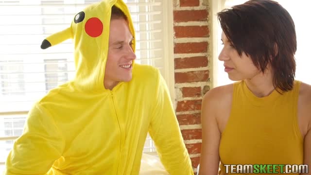 Katia kneels besides her older male lover and he shoots cum all over her young face and tits